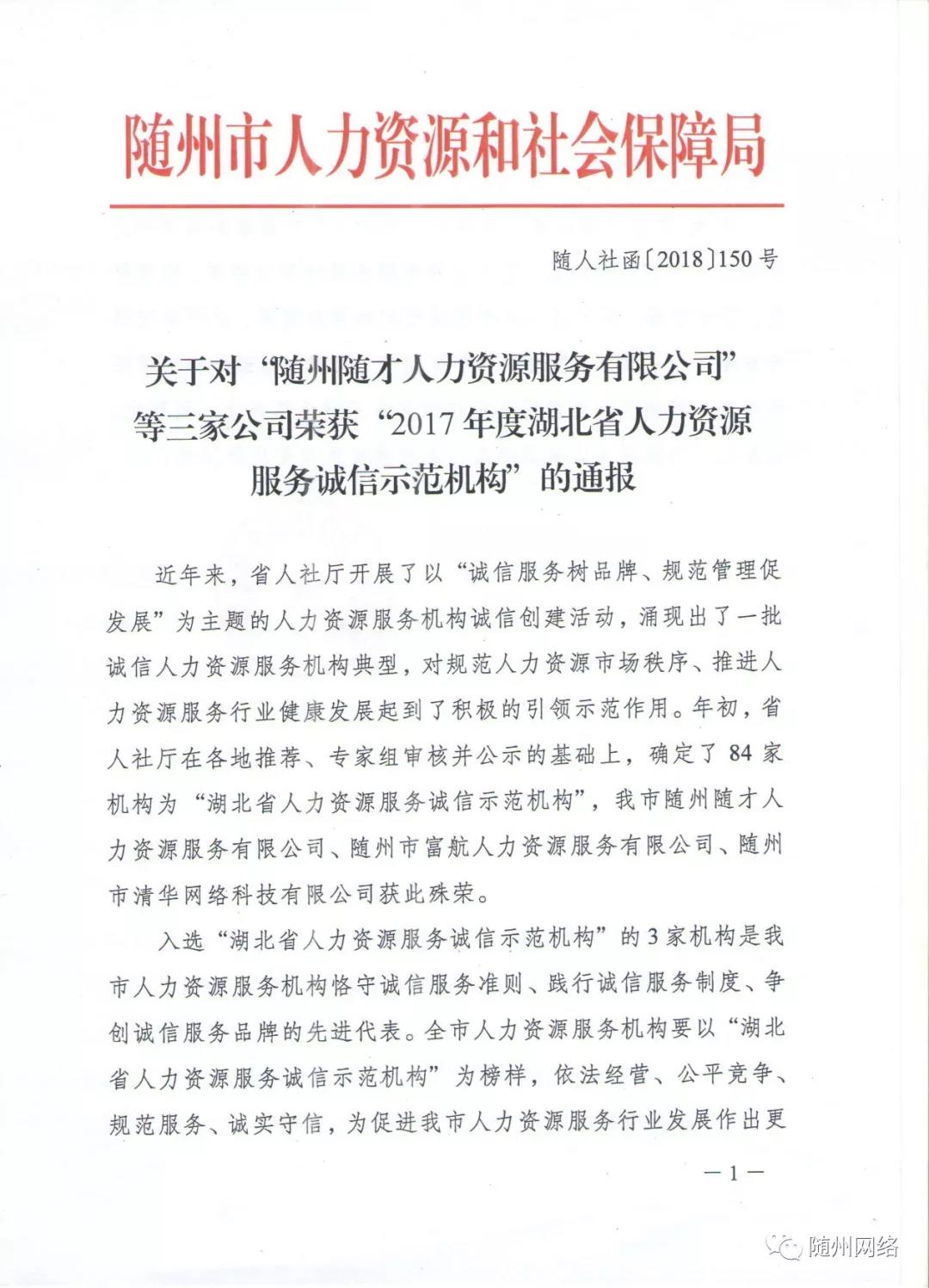 年初,省人社廳在各地推薦、專家組審核并公示的基礎(chǔ)上,確定了84家機(jī)構(gòu)為“湖北省人力資源服務(wù)誠(chéng)信示范機(jī)構(gòu)”,我市隨州隨才人力資源服務(wù)有限公司、隨州市富航人力資源服務(wù)有限公司、隨州市清華網(wǎng)絡(luò)科技有限公司獲此殊榮。